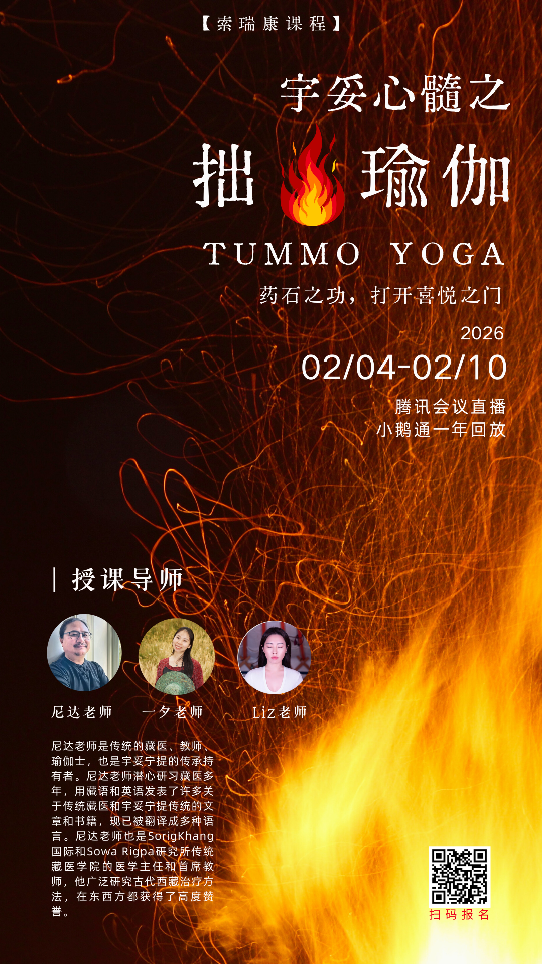 Guided by Dr. Nida Chenagtsang, you will be introduced to breath control, visualization practices, and body postures specifically designed to activate and balance your inner fire. Tsa lung taught by Liz Sung.